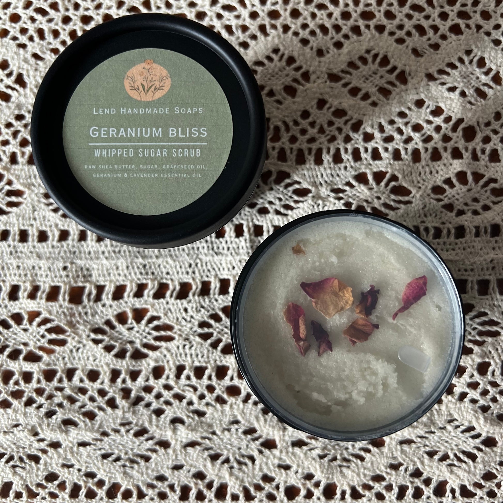 Handmade whipped sugar scrub made from all natural ingredients and scented with geranium and lavender essential oils.