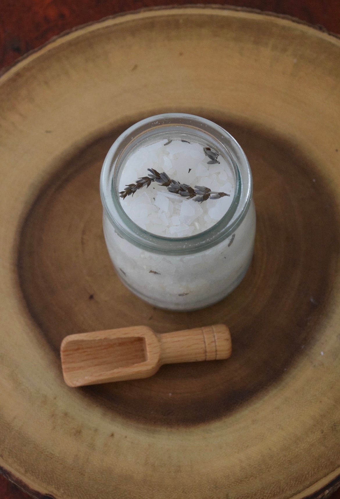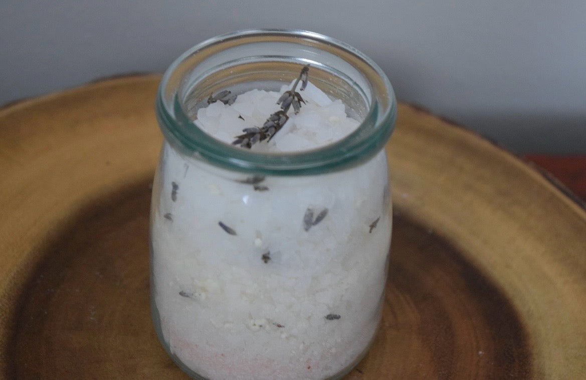 ingredients: Dead Sea salt, Himalayan pink salt, powdered goat milk, lavender buds, lavender essential oil.