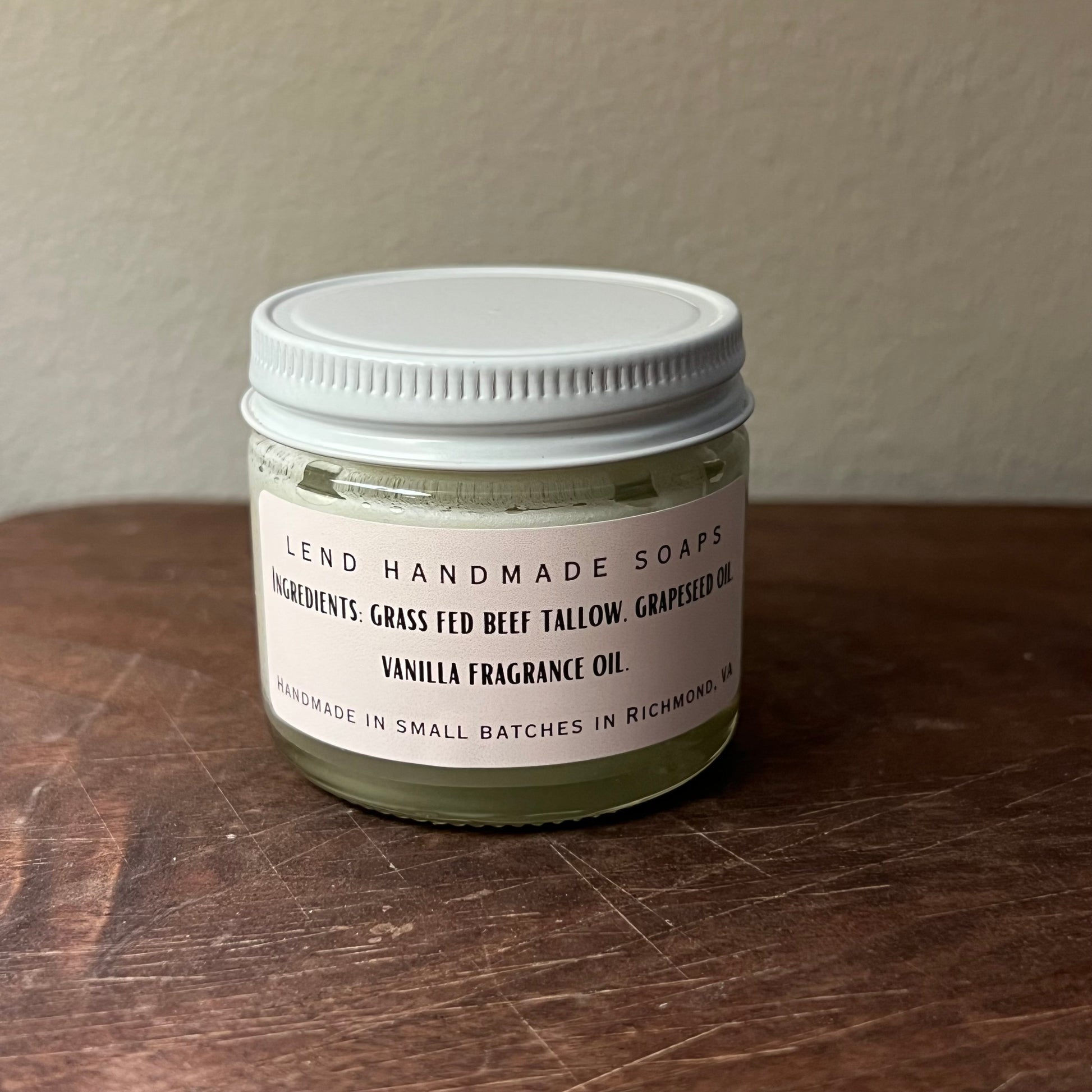 Ingredients: Grass-fed beef tallow, extra virgin olive oil, scented with phthalate free vanilla fragrance